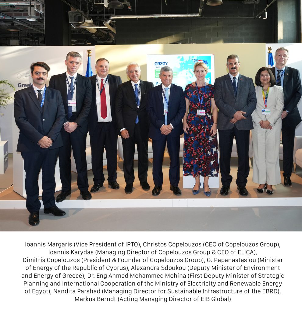 Η ηλεκτρική διασύνδεση της Ελλάδας με την Αίγυπτο, GREGY, φέρνει την Ελλάδα στο προσκήνιο της πράσινης μετάβασης στη Μεσόγειο, κάτι που επεσήμαναν οι ομιλητές κατά τη διάρκεια της ειδικής εκδήλωσης που πραγματοποιήθηκε στο Ελληνικό Περίπτερο. Όπως σημείωσε χαρακτηριστικά ο κ. Ιωάννης Καρύδας: «Εργαζόμαστε εντατικά για ένα έργο που θα αλλάξει τα ενεργειακά δεδομένα όχι μόνο για τη χώρα μας, αλλά για ολόκληρη την Ν.Α Ευρώπη, βάζοντας ουσιαστικά τη Μεσόγειο στο προσκήνιο της ευρωπαϊκής πράσινης μετάβασης». Ο κ. Καρύδας τόνισε την σημασία του έργου GREGY για την Ν.Α. Μεσόγειο και την Ευρώπη στην προσπάθεια επιτάχυνσης της ανθρακοποίησης, της επίτευξης της αναγκαίας πράσινης μετάβασης και της διαφοροποίησης των πηγών ενεργειακού εφοδιασμού της χώρας μας, αυξάνοντας την ενεργειακή μας ασφάλεια, και αναφέρθηκε στα επόμενα βήματα ανάπτυξης του έργου με την εκπόνηση των οριστικών μελετών του. Όπως δε τόνισε, το GREGY εκτός από τα σημαντικά ενεργειακά, περιβαλλοντικά και οικονομικά οφέλη που θα έχει για την Ελλάδα και την ευρύτερη περιοχή, αποτελεί ένα ιδιαίτερα σημαντικό γεωπολιτικό έργο και το θεμέλιο λίθο για τη δημιουργία διαδρόμων Βορρά-Νότου και τη μεταφορά πράσινης ενέργειας.